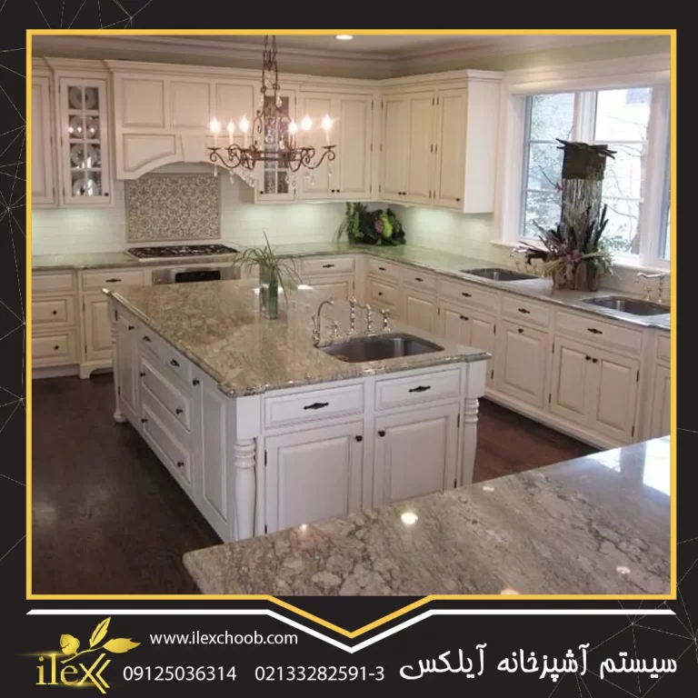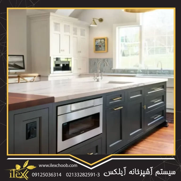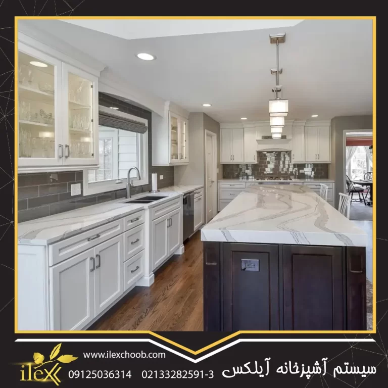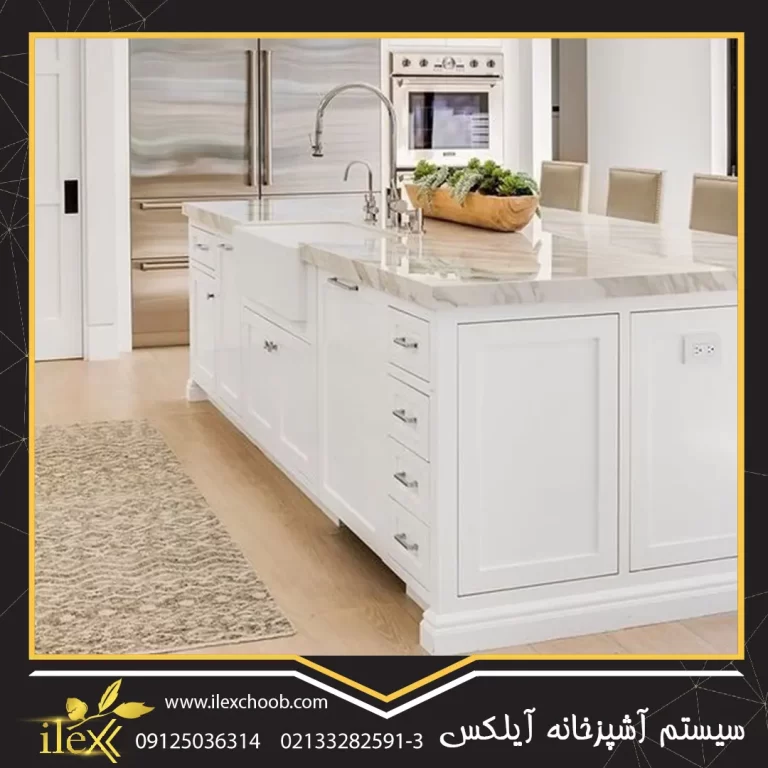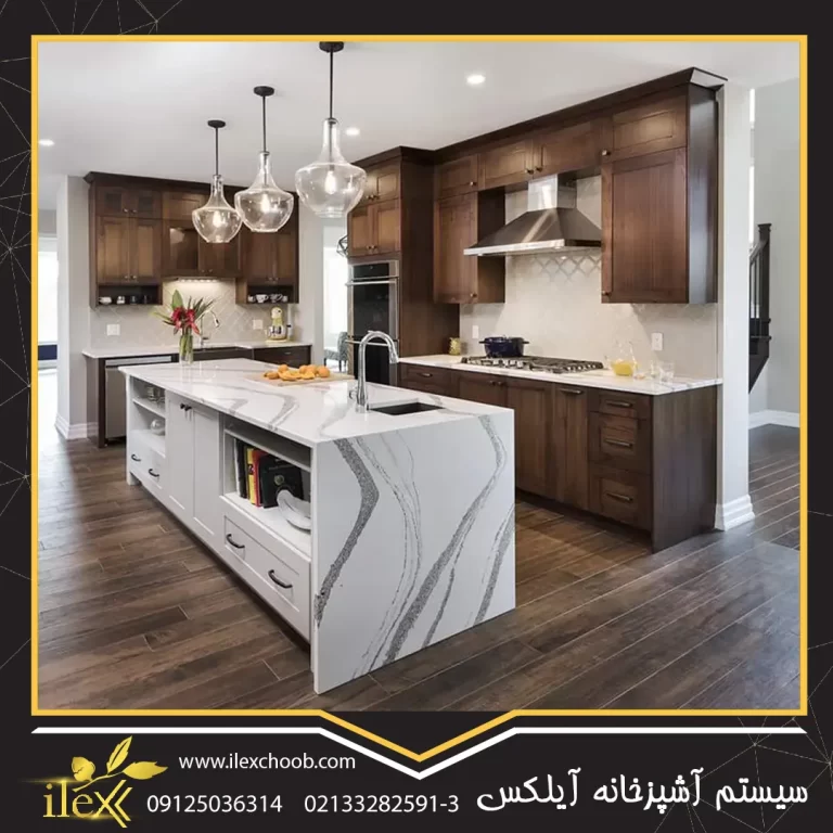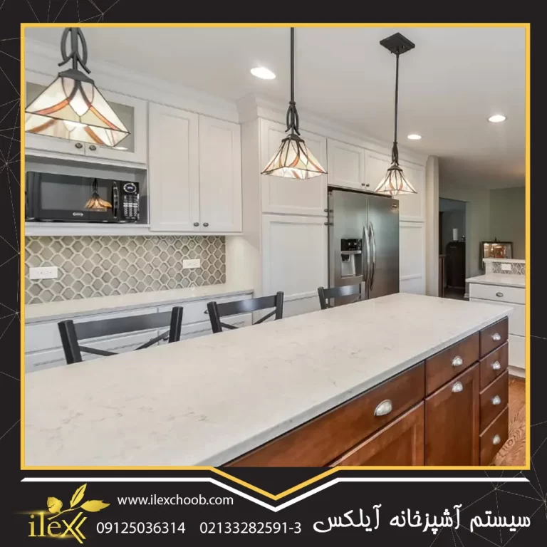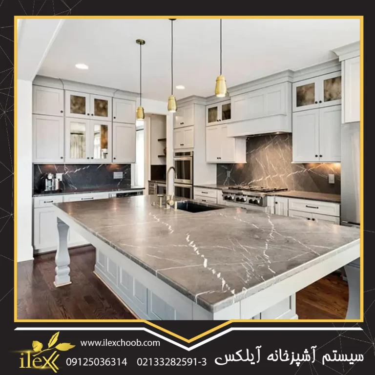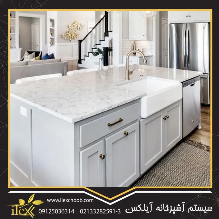 - صفحه کابینت (کانترتاپ): اغلب از سنگ کوارتز یا سنگ طبیعی ساخته میشود تا حس یک کابینت لوکس را منتقل کند.